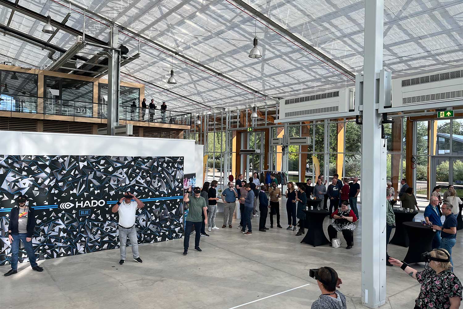 Een bedrijfsevent op locatie? Speel hado in onze pop-up arena! Die zetten we in jullie bedrijfshal of op een andere locatie. Alles nemen we mee: achterschermen, AR-brillen, polssensoren en verlichting. En eventueel ook een tv-scherm. De pop-up arena past in ruimtes van 12 x 8 meter en groter. Het plafond is minstens 2,8 meter en er is stroomaansluiting.