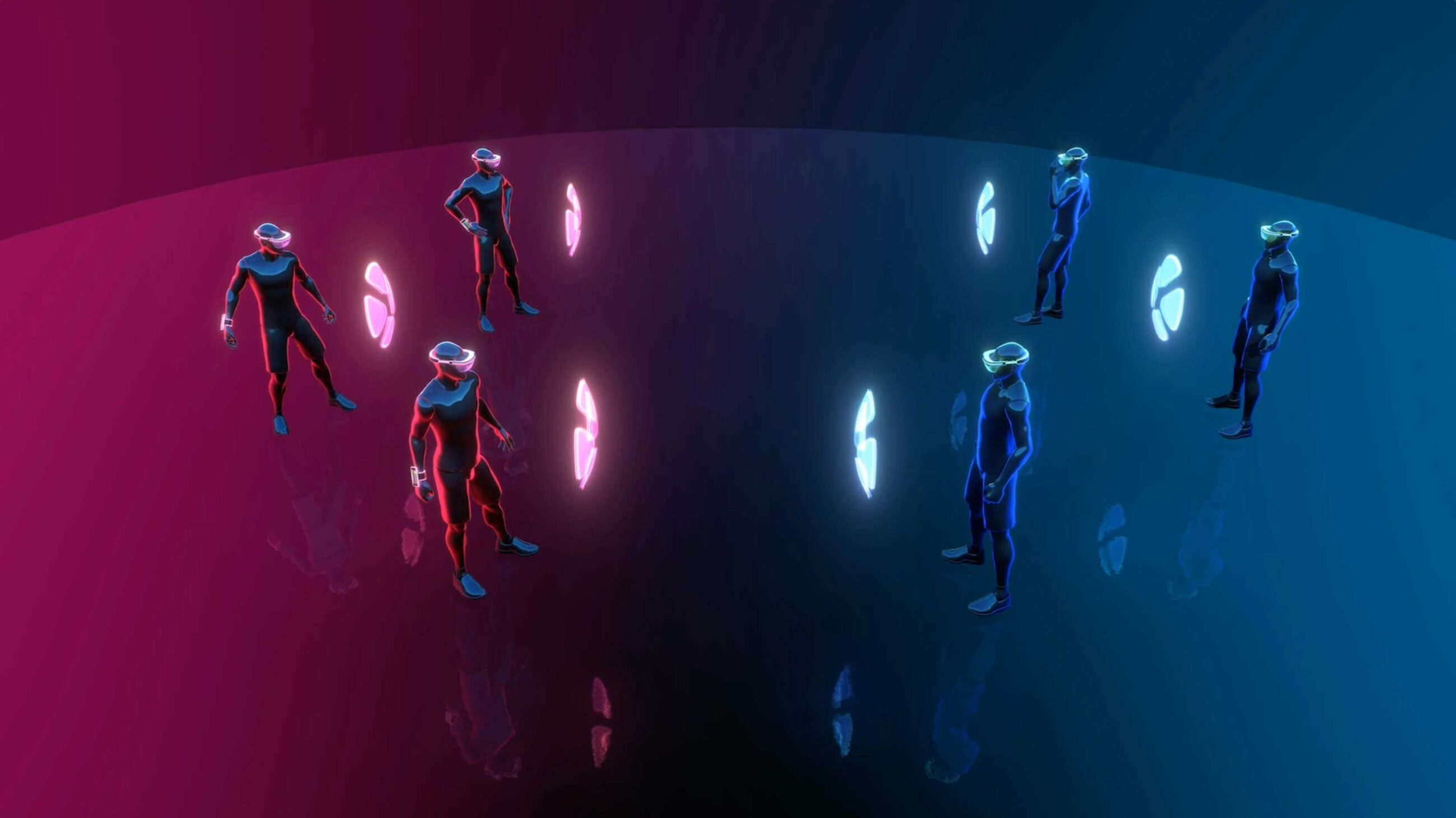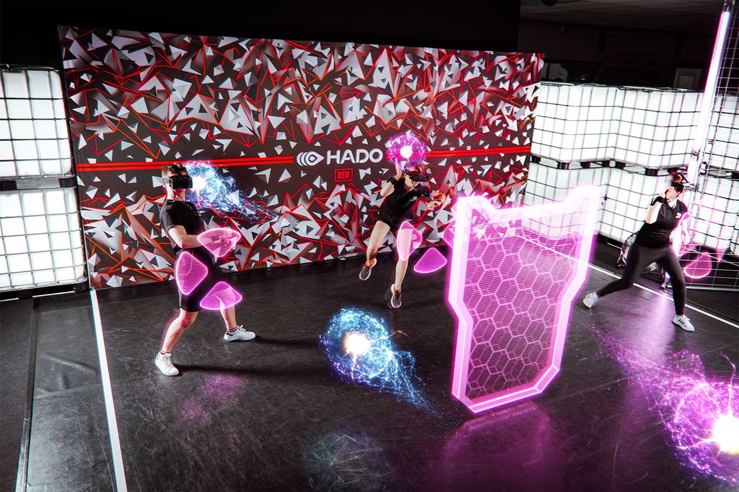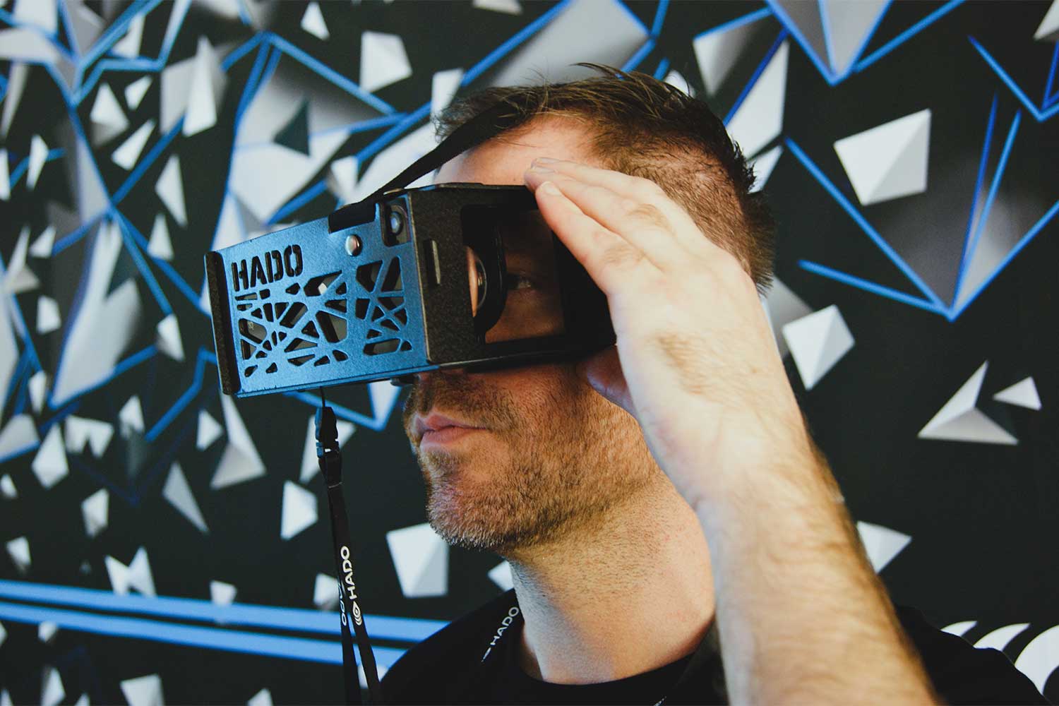 Je krijgt een AR-bril. En een polssensor om de arm waarmee je die virtuele ballen gooit. Door de AR-bril zie je zowel de echte wereld (de spelers, de arena) als de virtuele ballen, de life cells en de schilden.